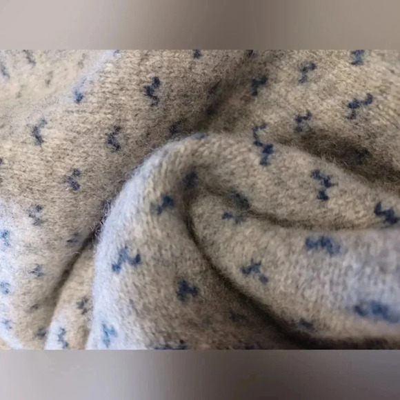 Gray with blue designs, this sweater features a round neck and ribbed cuffs. Size tag absent, please carefully consider measurements.