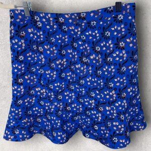 Lightweight crepe mini skirt with a flattering length and summery bandana print. Bright blue colour. Women’s size 2. Poly. Back zipper. Lined. Machine washable.