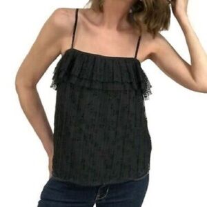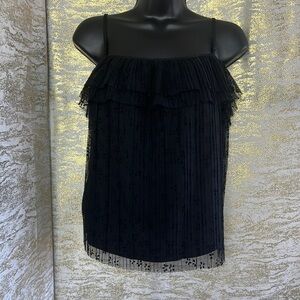 - J Crew Women's Black Fluttery Lace Cami Black Tulle Top ,Fluttery Lace Cami Black Tulle Mesh Top Ruffled Tank.Adjustable spaghetti straps,Double ruffle all around,Sheer flocked tulle over tonal lining,Side zipper