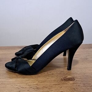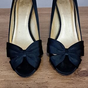 J. Crew Black Heels Women's Size 8 Fabric Upper Bow Open Toe Gold Made in Italy