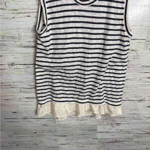 Stylish J. Crew tank with black and white stripes. Sleeveless design with a ruffled hem. Perfect for casual wear.