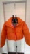 Bold orange puffer with a high collar. Features snap buttons and quilted design. Ideal for cold weather.