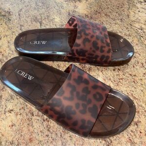 Experience the perfect blend of style and comfort with J. Crew's slide sandals, featuring a chic leopard print in brown and black. These sandals boast a wide single strap and a platform sole, making them ideal for casual outings. Enjoy a fashionable, easy-to-wear design that complements any laid-back look.