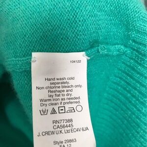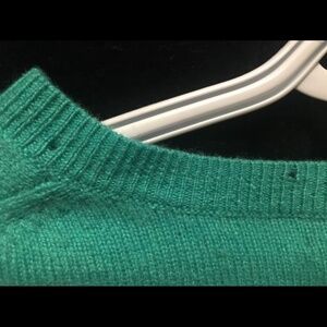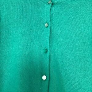 J. Crew 100% cashmere cardigan sweater in size small. Style 29863. Beautiful green. Soft and luxurious. 2 tiny pinholes near back collar (from tag removal) that need a stitch.