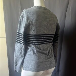 Elevate your wardrobe with this J. Crew crewneck sweater, showcasing a sophisticated gray base adorned with striking black stripes. Made from a soft knit fabric, it promises comfort and style for any casual setting. The timeless design ensures it remains a versatile staple in your collection. Size XS, 51 cm pit to pit, 65 cm length
