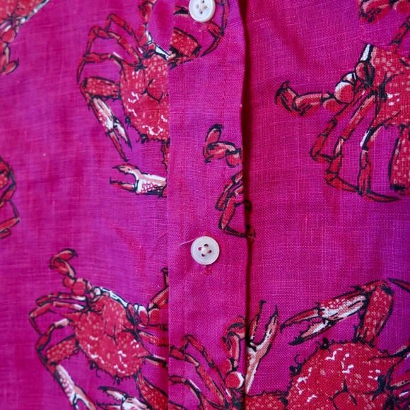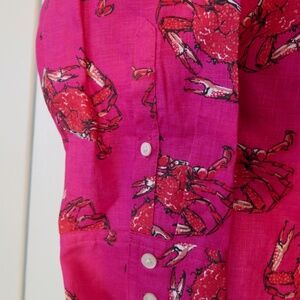 This listing is for a Pre-owned J. Crew Women's Ratti Linen Shirt - Size 12. It features a bold Ratti printed fabric with crabs in red outlined in black on a hot pink background.