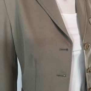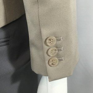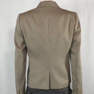 Really good condition. Classic wool blazer in tan gaberdine from J. Crew. Acetate lining. Flap pockets. (Note: Two tiny pin dot size marks on right front edge of jacket. See photo.)