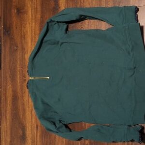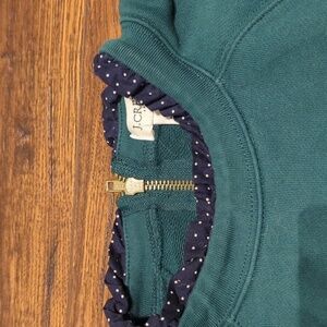 Dark green 100% cotton sweatshirt with navy blue, white polka dotted ruffles at neck and sleeve cuffs.