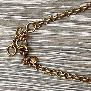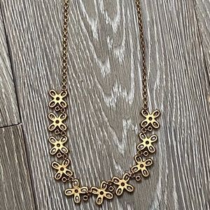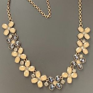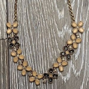 Excellent used condition. Only worn once. Adjustable length. Antiqued/ slightly brassed gold finish (not super shiny typical yellow gold) to intentionally give it a slightly vintage feel. Beautiful crystals and flowers in quite neutral tones so this necklace will pair well with many different colored outfits!