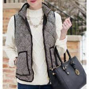 Features: quilted, patched side pockets, longer back style, herringbone pattern, black trim, zipper front closer
