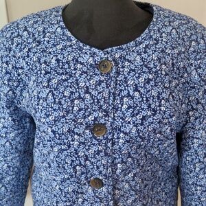 This listing is for a J. Crew collarless quilted jacket with button closure. It is made from a blue ditzy floral print and plain blue lining. This item is US size 16 and is a generous fit. No condition issues.