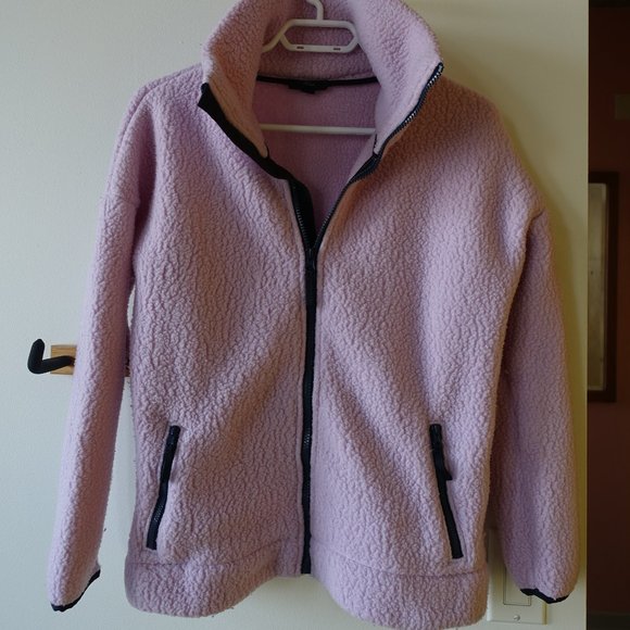 Light pastel lilac lavender purple color with navy trim. Perfect for winter and fall. Lightweight but insulating.