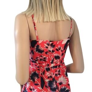 Features: Elasticized at back waist affords some flexibility of fit, fully lined, vivid floral print, adjustable spaghetti straps, stitching detail and darted bodice, rests above the knee