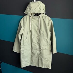 This J. Crew rain coat in a soft green shade combines a modern utilitarian design with a relaxed fit, making it ideal for spring or fall. Its lightweight fabric ensures comfort and versatility for various occasions.