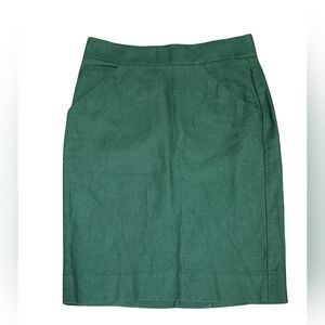 This J. Crew pencil skirt features a deep green color, perfect for a professional setting. Its knee-length design and form-fitting silhouette provide a sleek and polished look. The skirt's simplicity ensures it remains a versatile wardrobe staple.