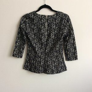 In a custom-developed fabric (cotton lace outside and smooth jersey inside), it's stretchy and soft but still has the structure of a peplum top.