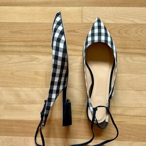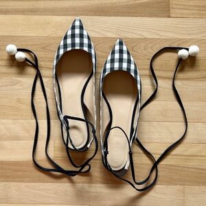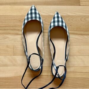 J. Crew Lily Ballet Flats Gingham Print Navy White with Ankle Wrap Size 9