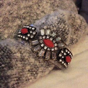 Perfect condition; J. Crew bracelet with clear set crystals and burnt orange faceted stones on Lucite cuff. Cuff has slight give, fits best on a smaller wrist. "J. Crew" embossed on rear of center setting.