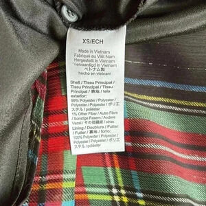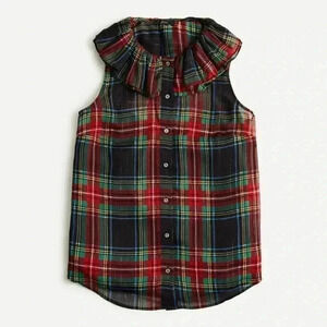 Vibrant plaid design. Sleeveless with ruffle detail. Button-up front. Perfect for casual outings.