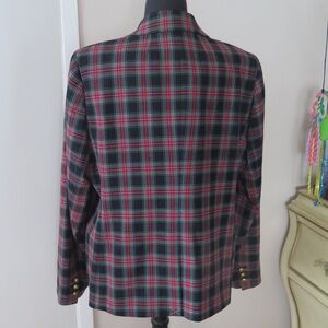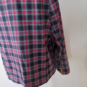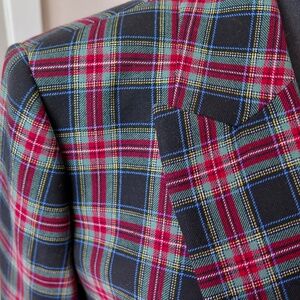 A slightly shrunken silhouette cast in a festive stretch tartan with bright gold buttons.