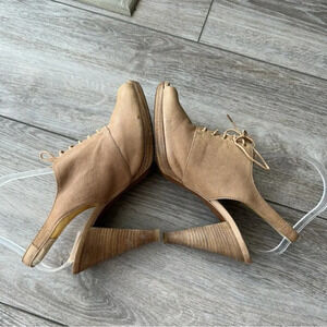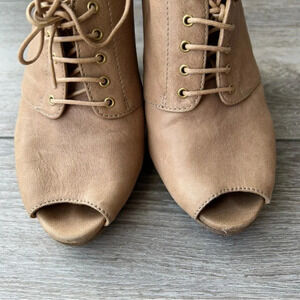 J Crew Peep Toe Lace Up Tan Leather Slingback Wooden Heel Pumps
