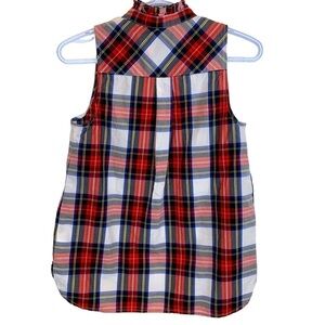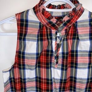 Perfect for the holidays! Beautiful J. Crew red navy and white tartan sleeveless ruffle neck blouse in excellent used condition.