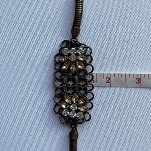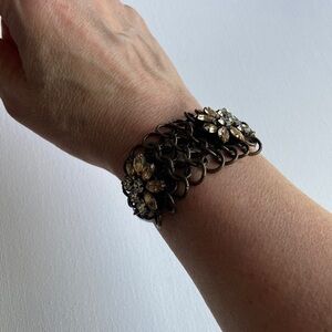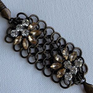 Striking bronze-toned bracelet with rhinestones from J Crew. Chainmail is the base for the rhinestones with cobra chain sides. Very unique piece with an art deco vibe.
