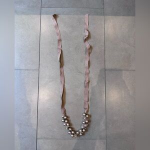 This ribbon and bead necklace is from J Crew. It is 45” long and the part with the pearls is 8”. It is meant o be tied behind your neck and you can adjust the length of it yourself. Excellent condition.