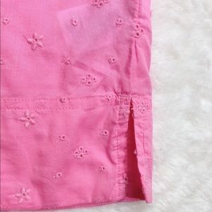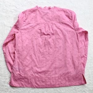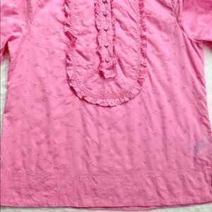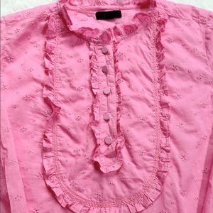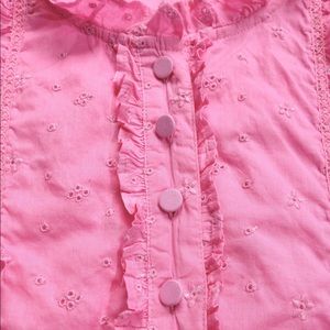 The magic of this wear-anywhere blouse is all in the fine print. A delicate Ruffle neckline, a subtle eyelet base and classic covered buttons make it the ultimate look-a-little-closer style.