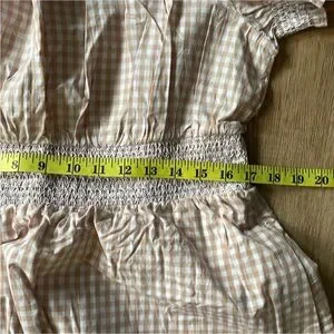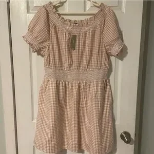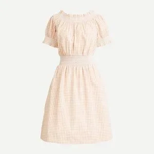 This vibrant sundress from J. Crew features a playful ruffled and pleated design in striking orange and pink hues. The off-the-shoulder neckline and puff short sleeves add a touch of elegance, making it perfect for casual outings or resort wear. Its midi length and lightweight fabric ensure comfort and style in warm weather.