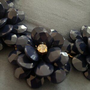 This J. Crew statement necklace features a floral design with 1.5" flowers in navy blue and clear rhinestones that add a touch of sparkle.