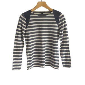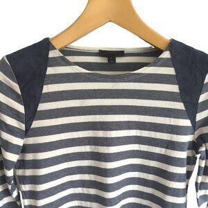 This is a grey and white striped t-shirt with faux suede shoulders by J. Crew.