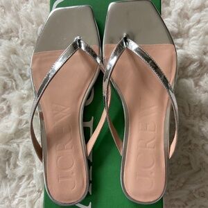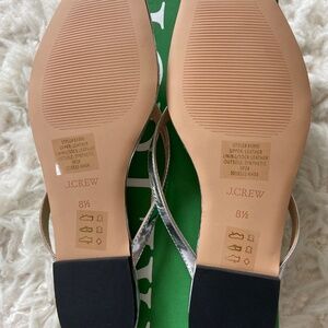 Brand new, never worn, in box. Purchased in spring of 2024 from J. Crew online. Capri thong sandals in metallic leather; silver mirror. Size 8.5. Sold out.