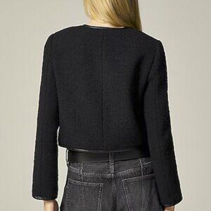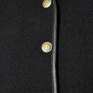 The body of the jacket is 55% wool/45% polyester, with leather trim and gold buttons.