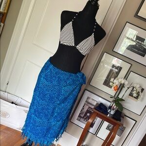 Dive into style with this striped J. Crew bikini top featuring a chic white and blue color palette. The triangle bikini top offers a classic - and adjustable - look, while the blue patterned sarong adds a touch of elegance with its intricate geometric design. Perfect for making a statement at the beach.
