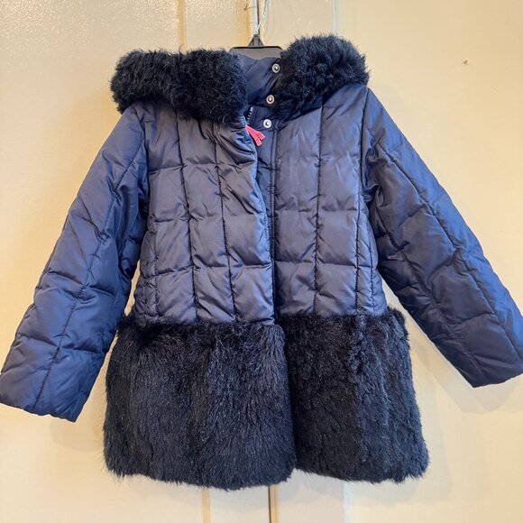 Beautiful hooded navy puff coat with faux fur detail around hem and hood. Preloved with no stains nor signs or wear.