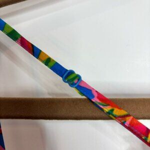 Vibrant floral top with spaghetti straps, perfect for a summer day. Features a stunning blue base with colorful floral patterns. Adjustable straps.