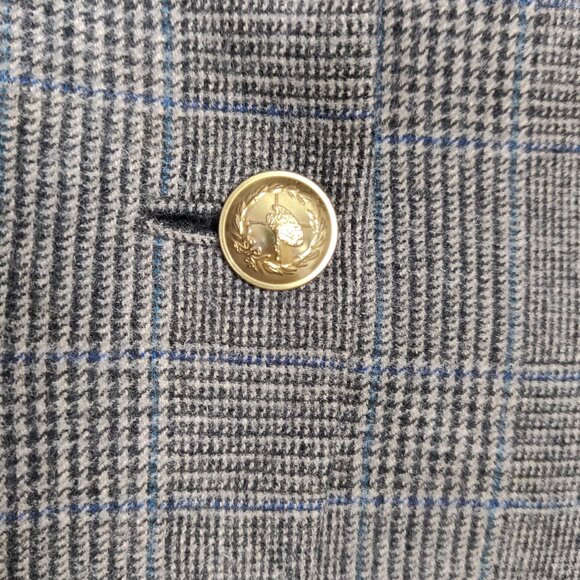 It features a grey glen plaid with blue accents, standing collar, two front flap pockets, one gold button closure and four-button cuffs, back vent, and long sleeves.
