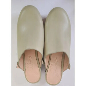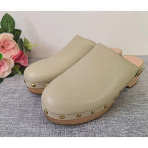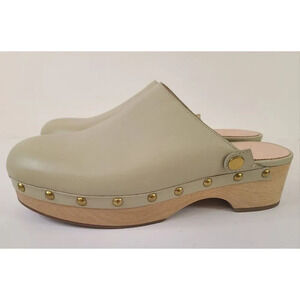 Very cute J. Crew studded wooden clogs in a pale olive green color. The back straps were cut and there is a pinch in the clog leather on one of them, captured in picture. Size 8.5 US, fits an 8 size.