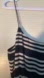 Beautiful navy with ivory stripes, fully lined. Dress is 100% silk, while lining is 100% polyester. Dry clean only. Straps do not adjust.