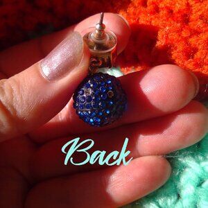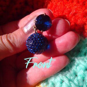 BUYER BE AWARE: There are small stones missing on the lower ball components of both earrings - approximately six. Easily fixable if you are handy with stone setting and touch ups. Shown in photos. Other than that, these are sparkly office to evening J. Crew earrings. The large deep blue sapphire colour gem is shiny and intact on both earrings, and there are dozens of blue stones set in the lower pieces, pave on resin. Shines with subtle sparkle, not too overwhelming, perfect size for daytime.