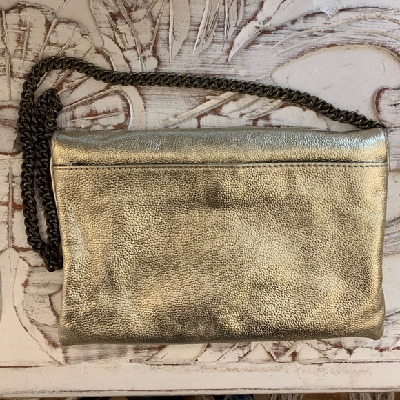 Genuine leather. One interior slip pocket and a large slip pocket on the back. Magnetic snap closure. Approx. 10.5” x 7” with a 11.5” strap drop.