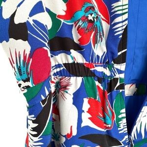 * fabric is easy care polyester in a colourful tropical floral print, lightweight fabric