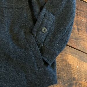 Elegant charcoal wool jacket with sleek design. Features button closure and pickets! Quality