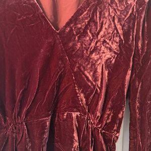 A velvet top with a faux wrap look. The color is described as “Bordeaux”. It has a stretchy back waist and side zip to create a sleek look. The original came with a removable wrap that I took off because it was too much fabric.