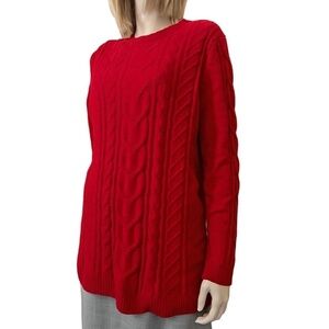 Features: Long sleeve, vented hemline, cable knit, ribbed hemline and cuffs, crew neck, super soft textile, stretch fabric