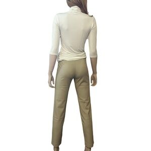 Features: Faux seamed pocket and mock front fly, minimalist style, darted waist at back, high rise cigarette pant silhouette, flat front and back, stretch fabric