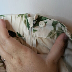 Made from a breathable linen blend, these size small pants feature a relaxed wide-leg silhouette and a stunning cream background patterned with vibrant tropical leaves. They're perfect for staying cool and stylish on hot summer days.
