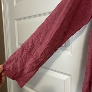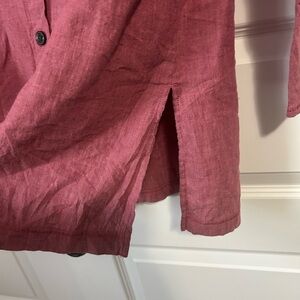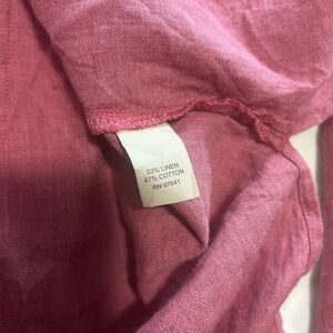 This relaxed pink tunic from J. Jill features a mandarin collar and a buttoned front, offering a sophisticated and comfortable style. The lightweight linen and subtle woven texture make it perfect for a chic, everyday look.
