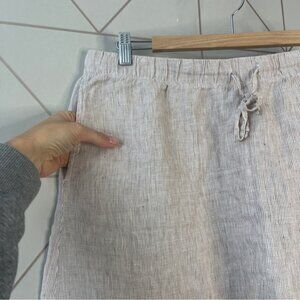 J. Jill Love Linen Skirt in very excellent pre worn condition. Lightweight and breezy, this J. Jill linen skirt features a subtle taupe and white pinstripe design with a comfortable elastic waistband and drawstring tie. Perfect for warm weather, it has a relaxed fit and side pockets, making it an effortless coastal-inspired piece to style with tanks, tees, or flowy blouses. Please see all photos.